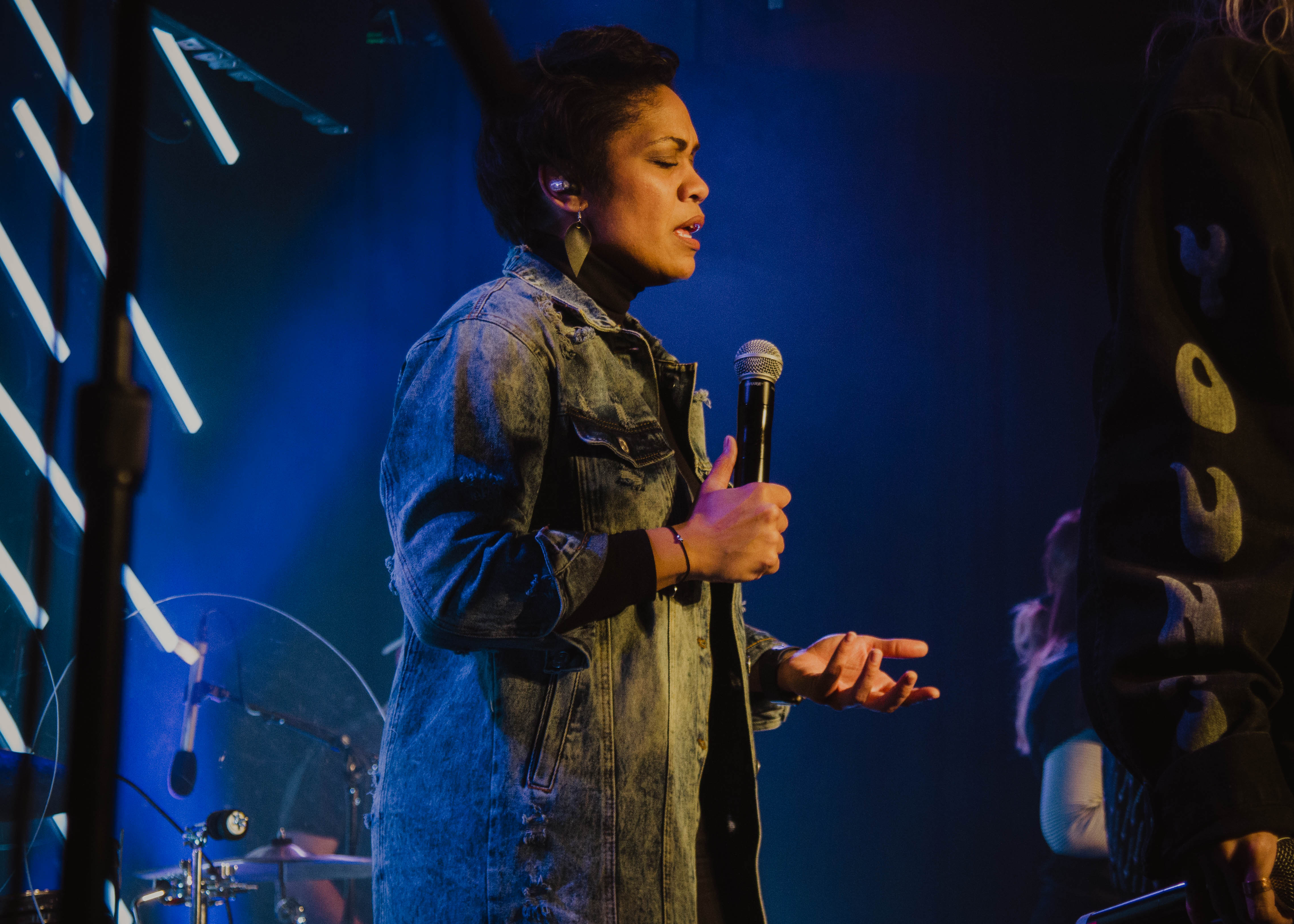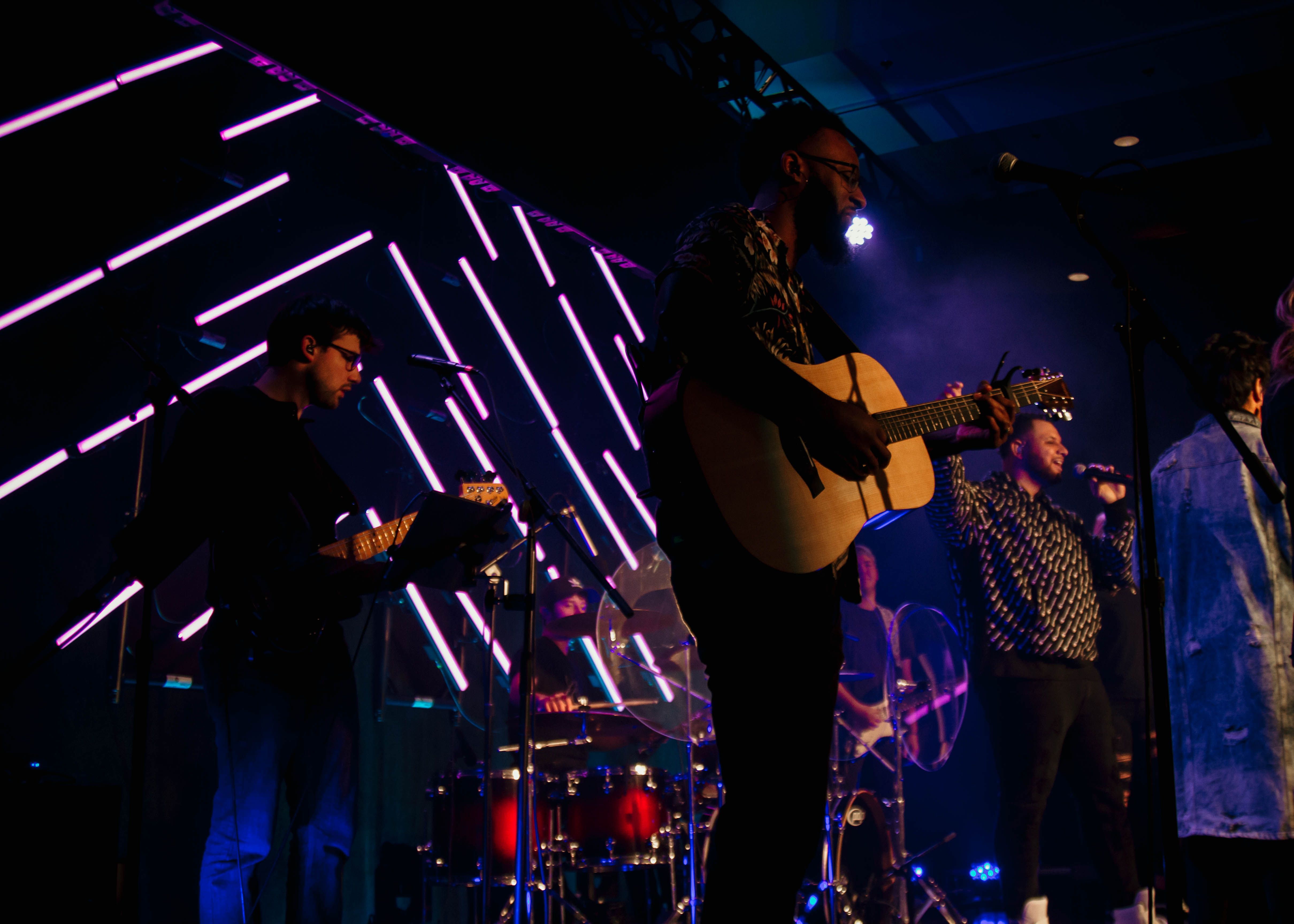 The stage lighting included a backdrop of the versatile Chauvet Professional Epix Strip Tour LED strip lights. For this production, the strip lights were staggered and angled in a triangle-formation that came to a peak in the center, drawing the audience in without causing distraction. Beneath the strip light installation was a row of Elation Professional Colour Chorus 48 fixtures adding a cool, subtle glow behind the band. Martin Mac Viper Profile moving lights provided key light and complemented the musical performance. Our grandMA2 console orchestrated it all from front-of-house with precise and reliable finesse.